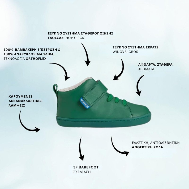 Τα παιδικά παπούτσια Hightop  της Hopfrög Kids έχουν σχεδιαστεί για να υποστηρίζουν τη φυσική ανάπτυξη του ποδιού, προσφέροντας άνεση, σταθερότητα και ανεξαρτησία στο παιδί. Ιδανικά για καθημερινή χρήση, προσφέρουν την αίσθηση περπατήματος με γυμνά πόδια, ενισχύοντας τη σωστή κινητική εξέλιξη των παιδιών.