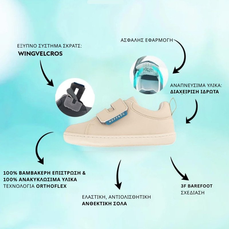Τα Casual κατασκευάζονται από οικολογικά και ανακυκλωμένα υλικά, χωρίς χρήση ζωικών προϊόντων. Η Hopfrög Kids προάγει τη βιωσιμότητα, φροντίζοντας τα παιδιά, το περιβάλλον και τα ζώα.