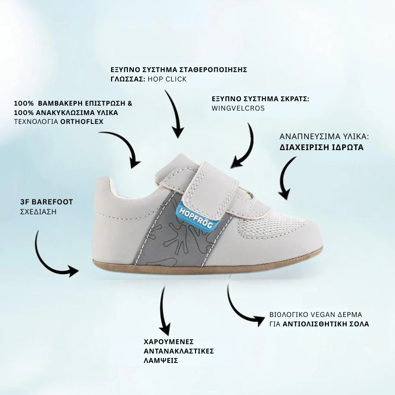 Το First Prime της Hopfrög είναι ο ιδανικός σύντροφος για τα πρώτα βηματάκια του μικρού σας. Με απαλή, εύκαμπτη σχεδίαση barefoot, στηρίζει τη φυσική κίνηση και συμβάλλει στην υγιή ανάπτυξη του ποδιού. Κομψό και άνετο, ταιριάζει με κάθε ντύσιμο και κάνει τις πρώτες αναμνήσεις αξέχαστες!